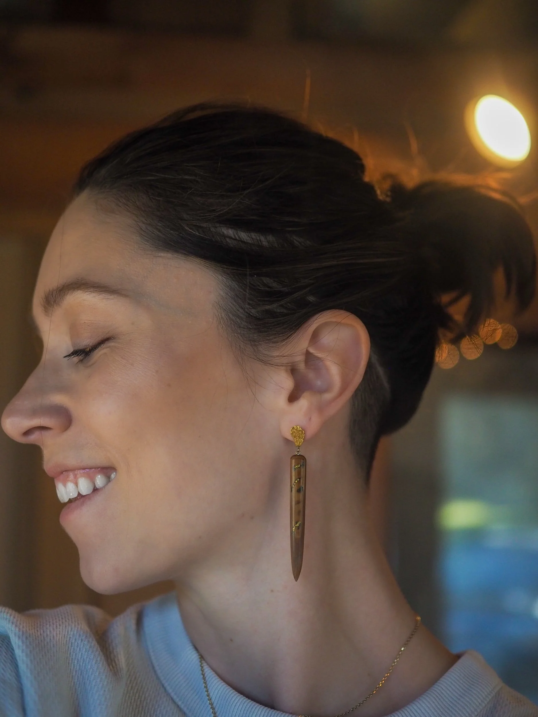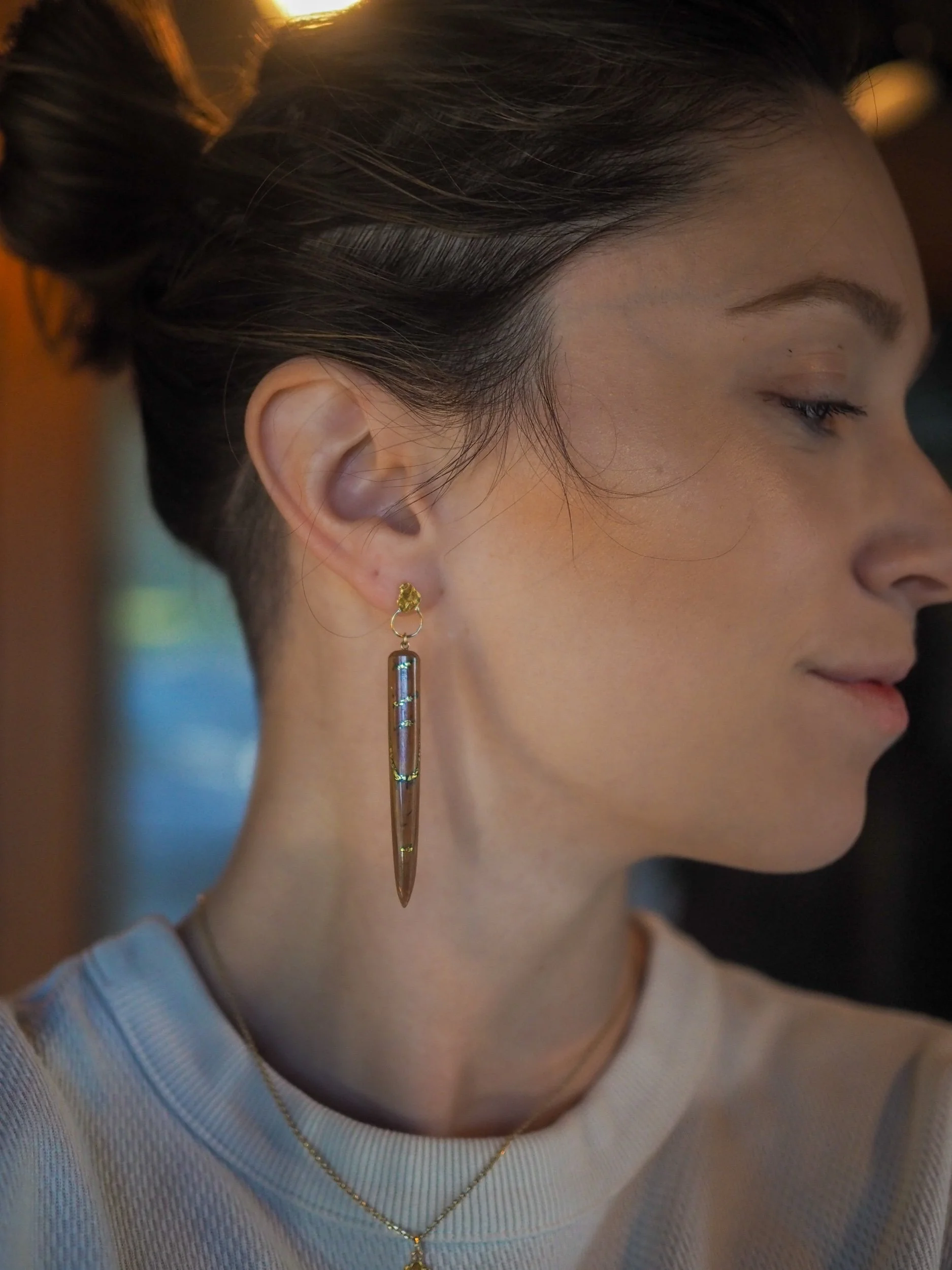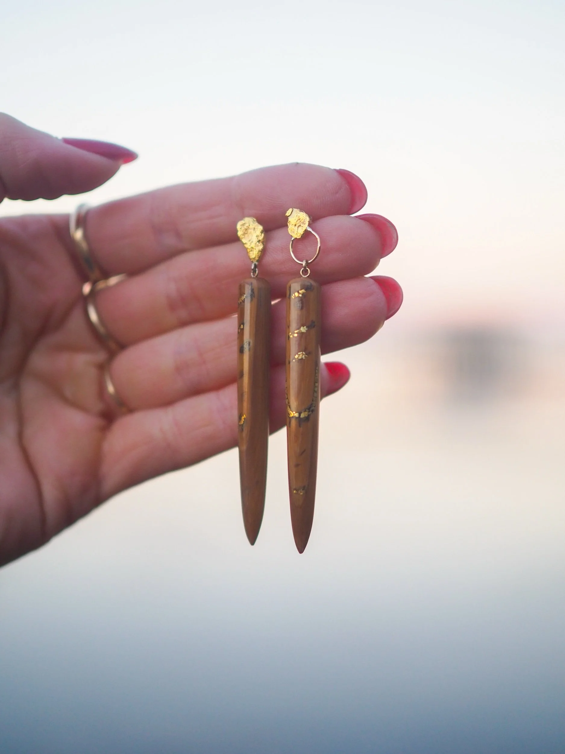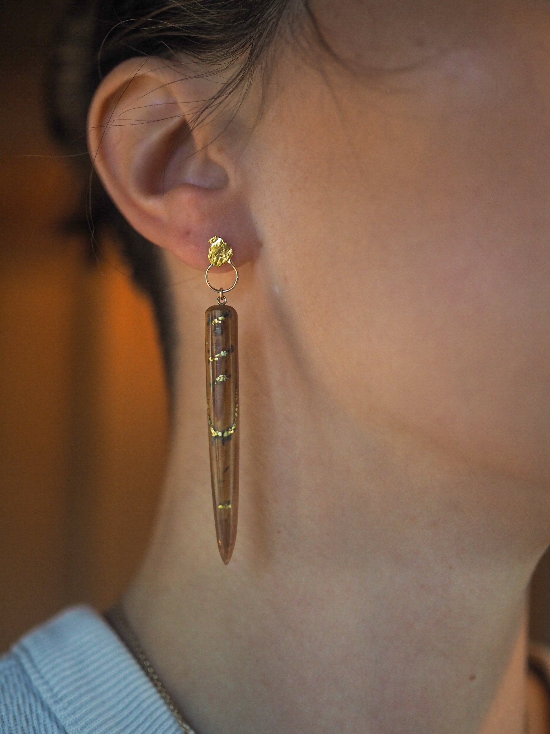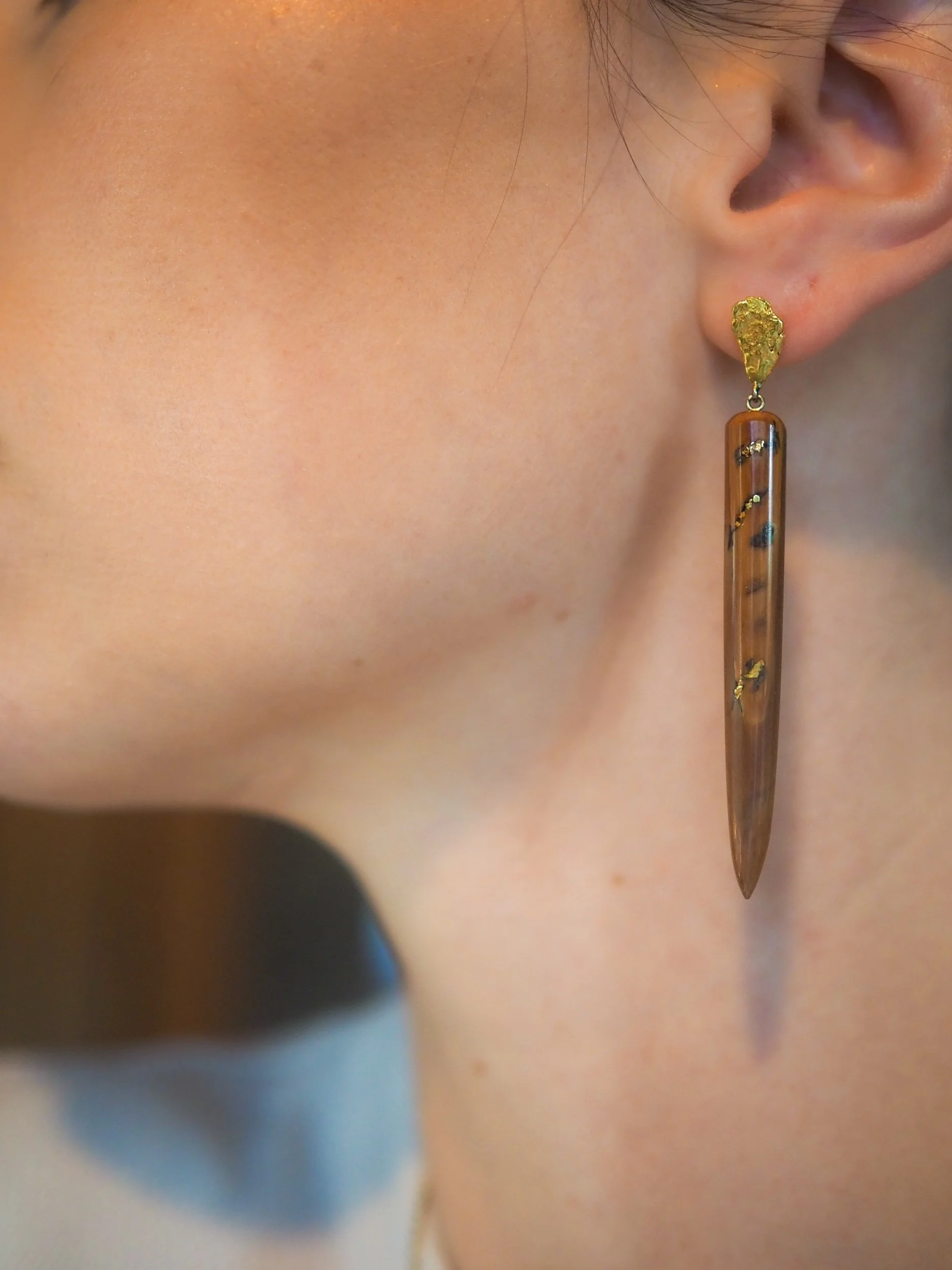 Embracing the beauty of imperfection, these striking brown mammoth ivory shards are mended with raw Alaskan gold. Each crack is a testament to time, history and the story that these earrings tell of a life in the vast Arctic during a time we can only imagine.