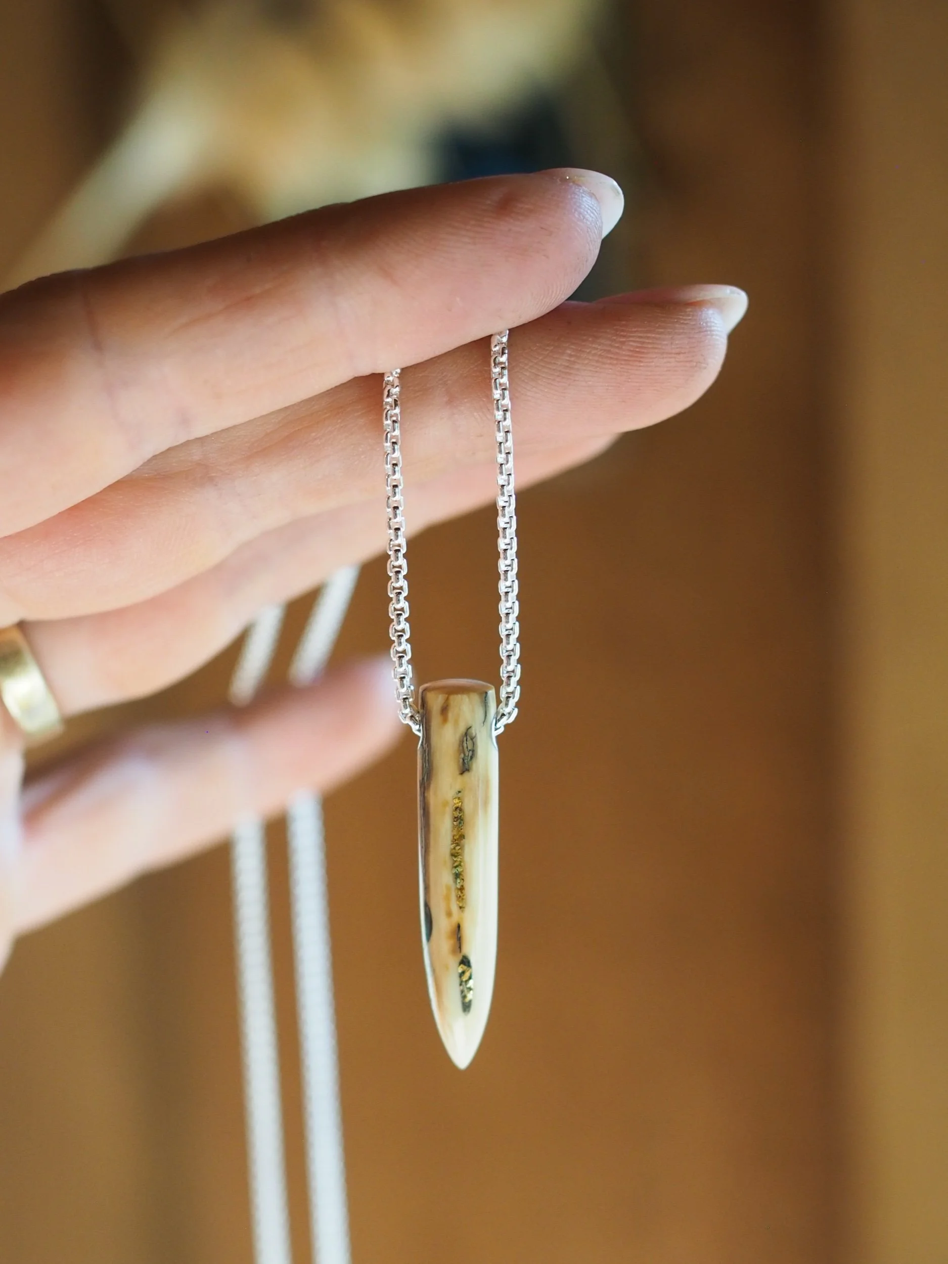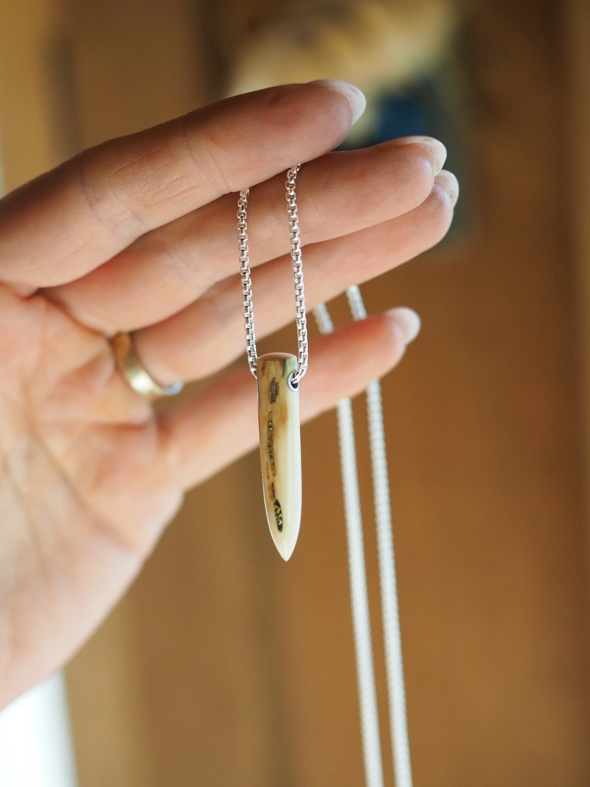 Materials: Woolly Mammoth Ivory, 14k Gold Piping, 14K Gold Bail, Gold Fill 24” 1.8mm Rounded Box Chain Included