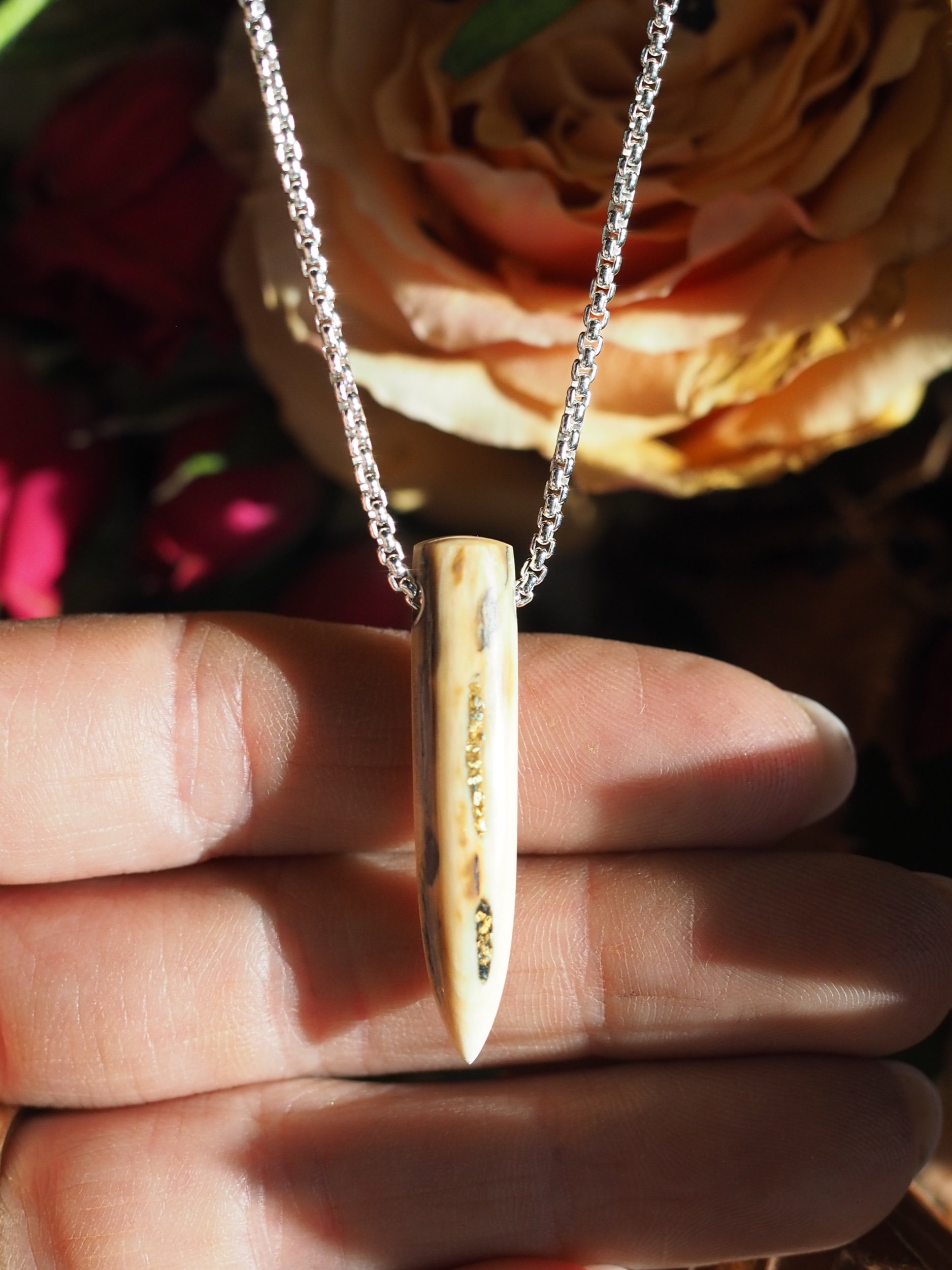 One of a kind woolly mammoth tusk necklace fashioned from ancient woolly mammoth ivory discovered at The Boneyard Alaska. Extremely rare vibrant blue vivianite is a standout feature in this mens necklace, sure to break the ice. The vibrant blue color and Earthy texture is elevated by 14k gold piping, 14k gold bail and raw 22k gold flakes.