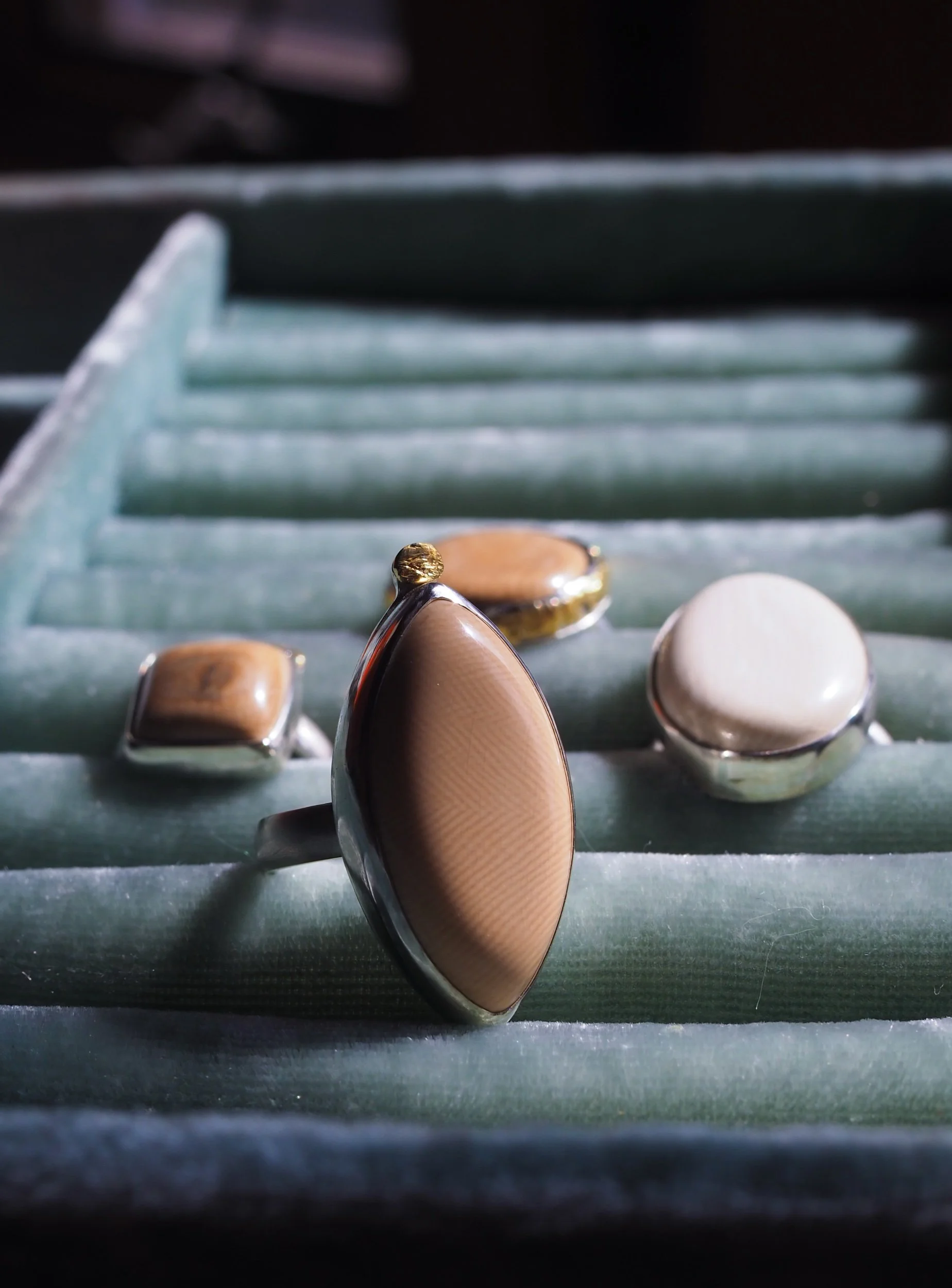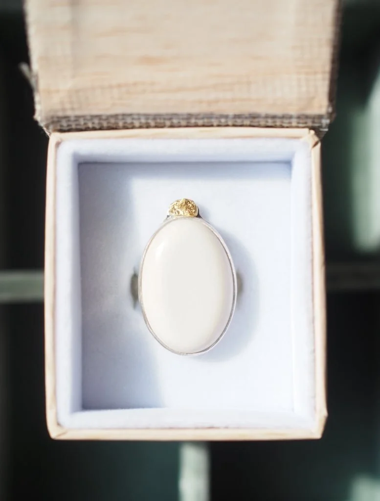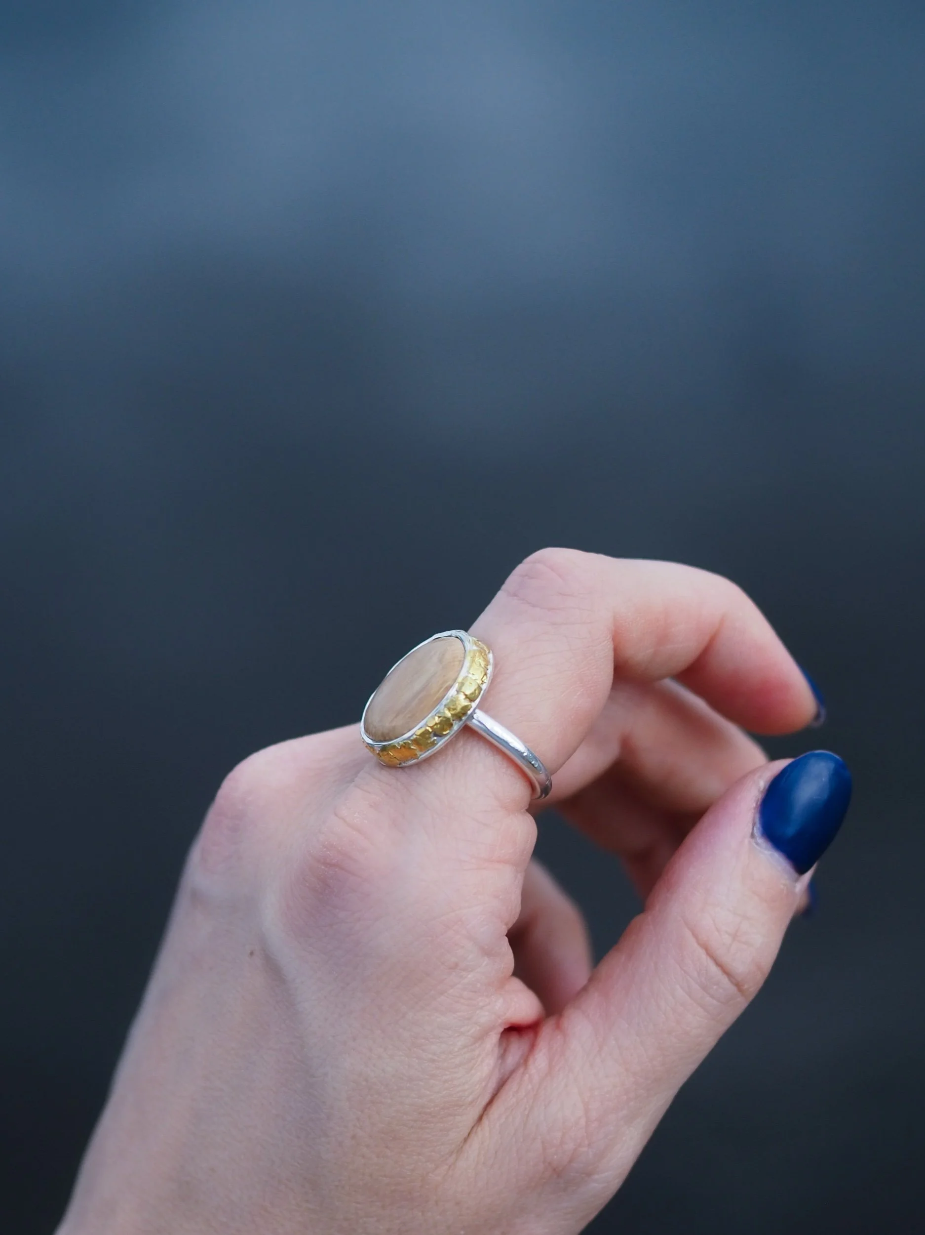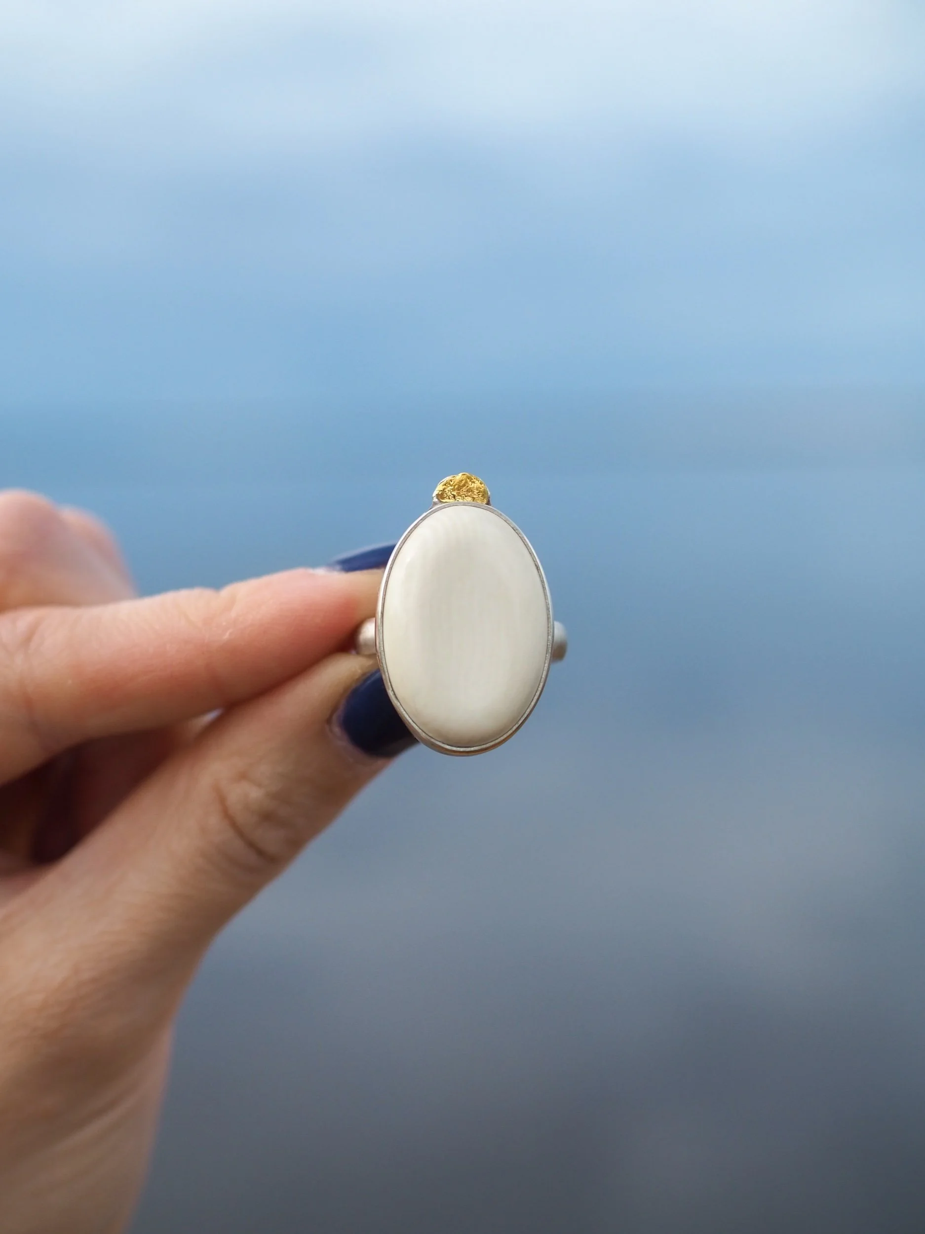 *Materials : Sub fossilized woolly mammoth ivory, polished sterling silver bezel/ brush silver ring, raw 21K-22K gold nuggets