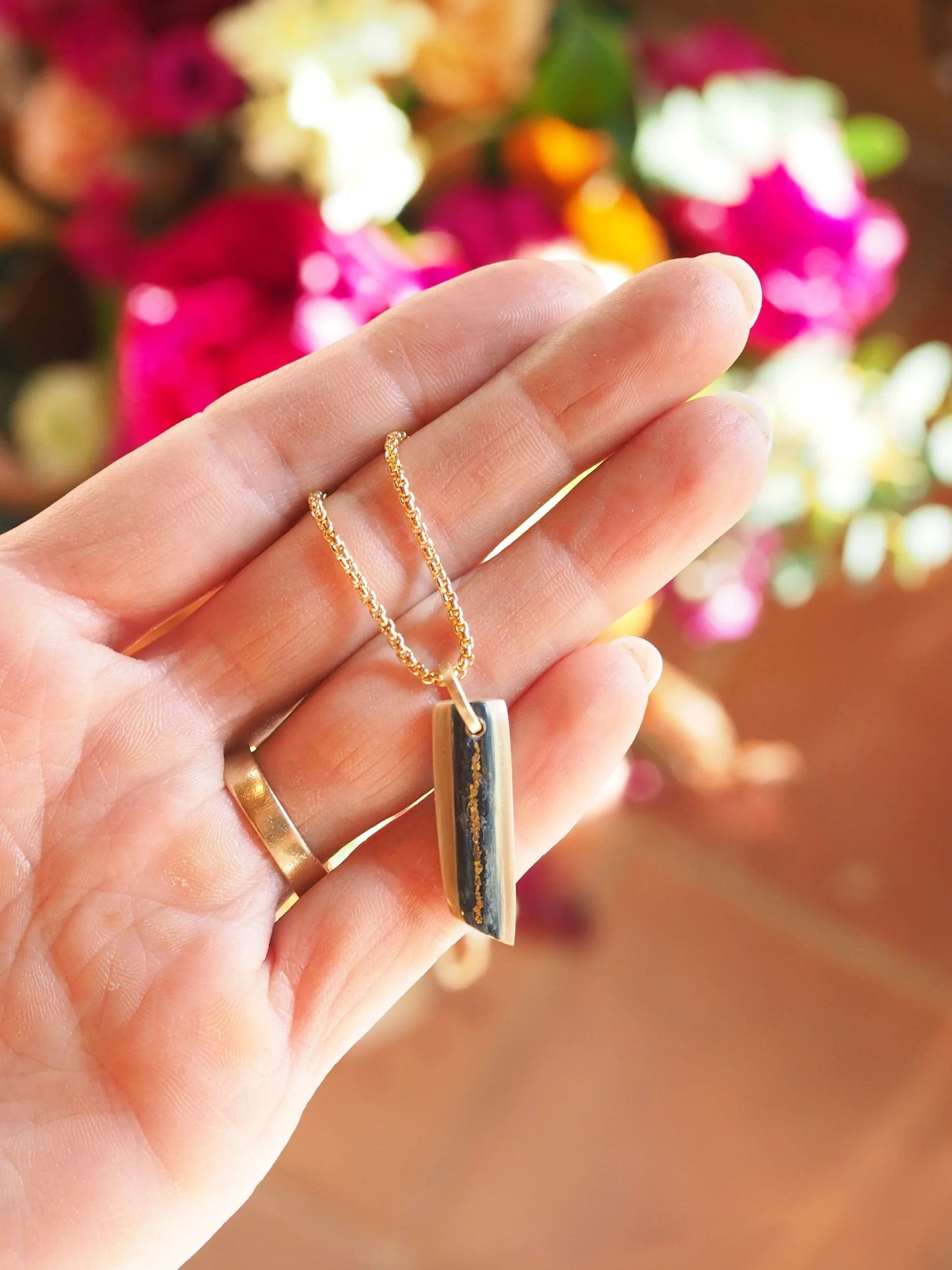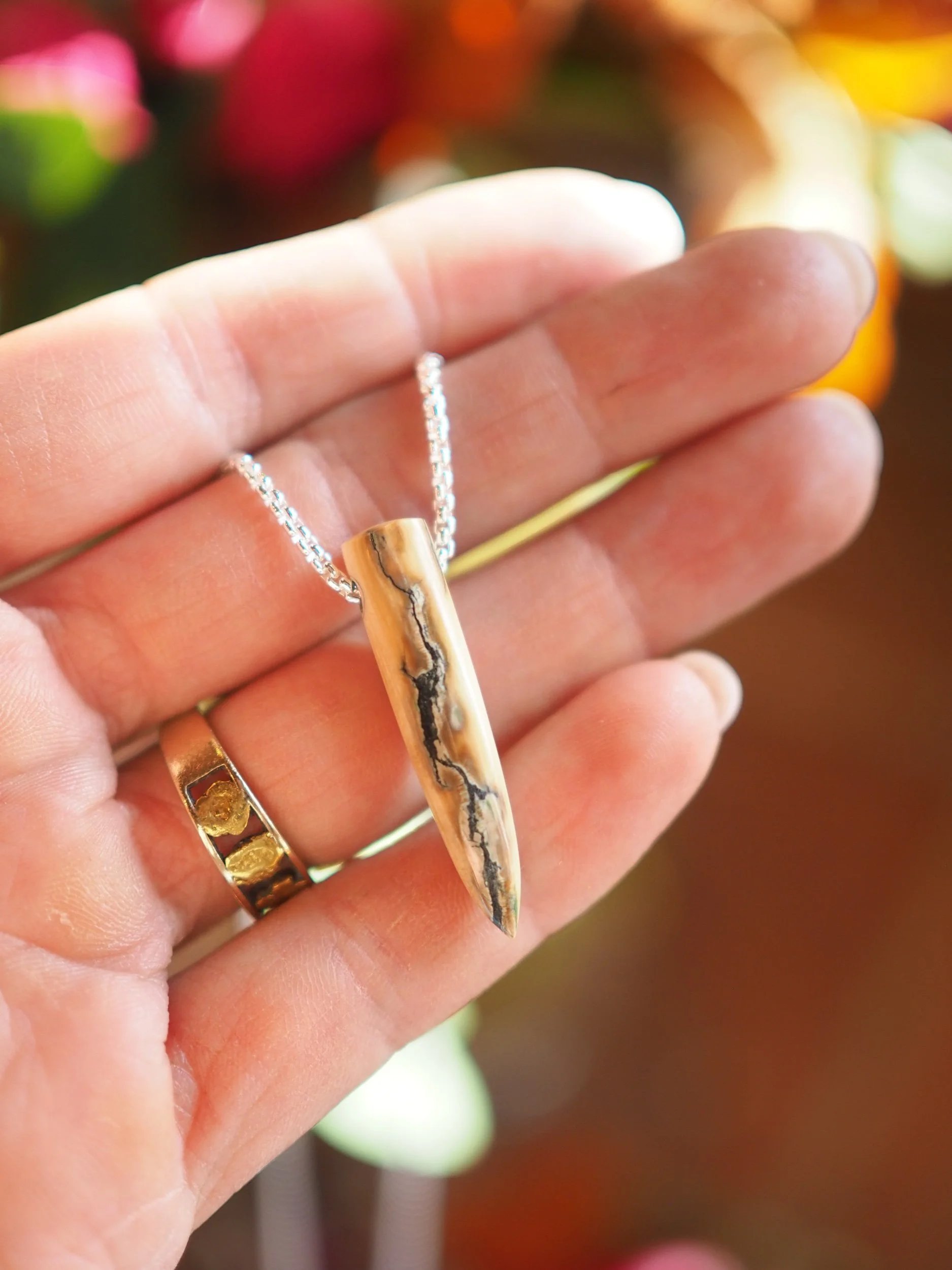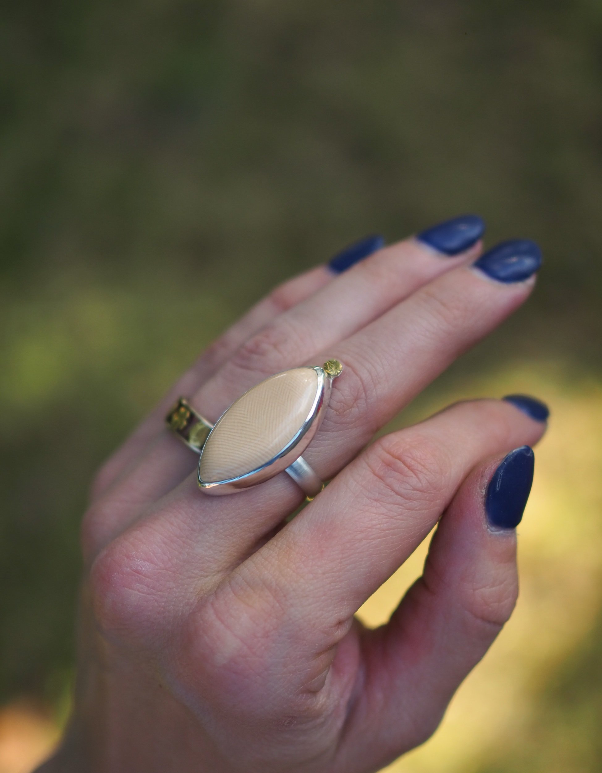 Warning, zooming in might cause hypnosis and spark a deep curiosity of planetary existence… Schreger lines unlike I have ever seen are the standout in this mammoth cabochon adorned with a raw gold nuggets set in a sterling silver ring.
