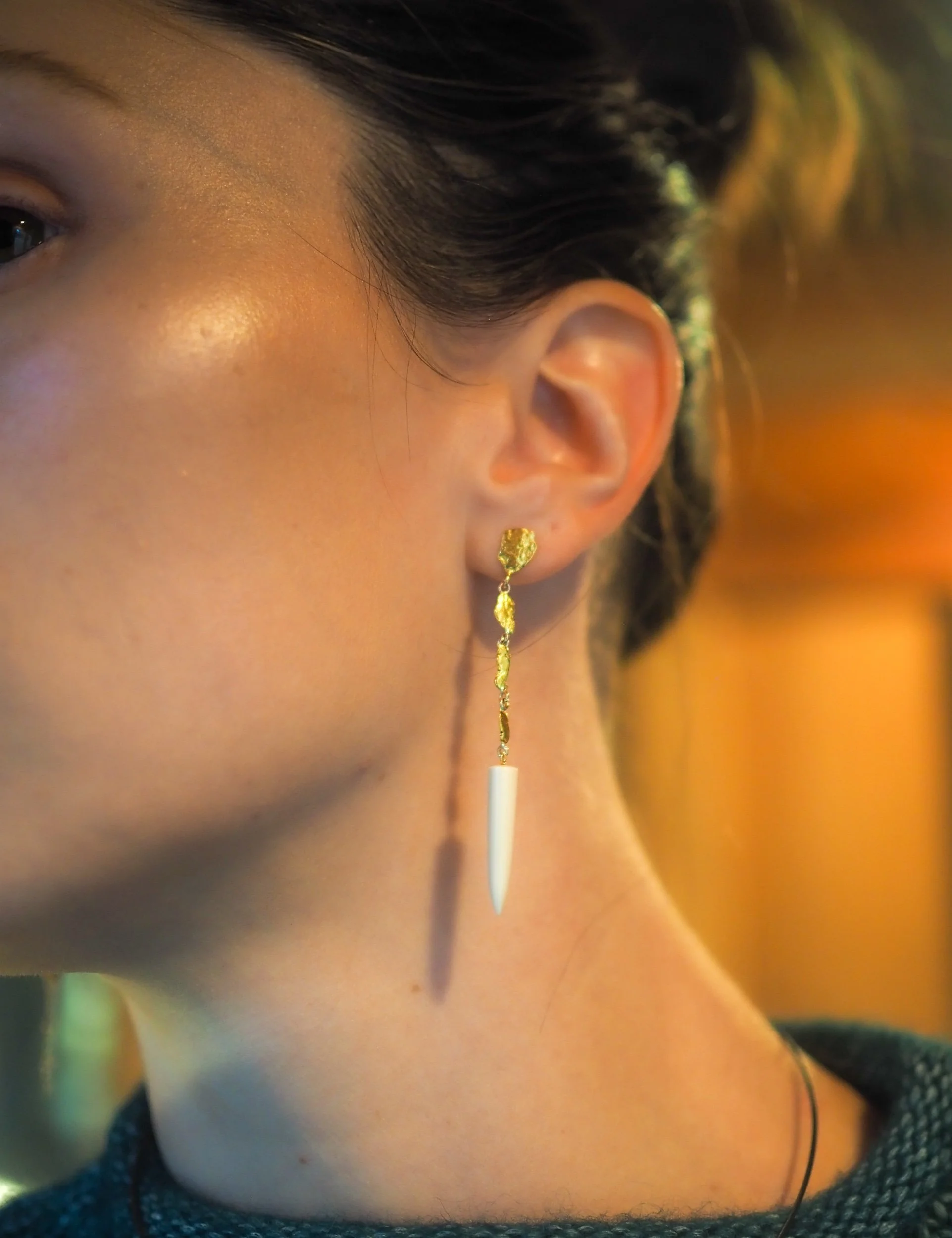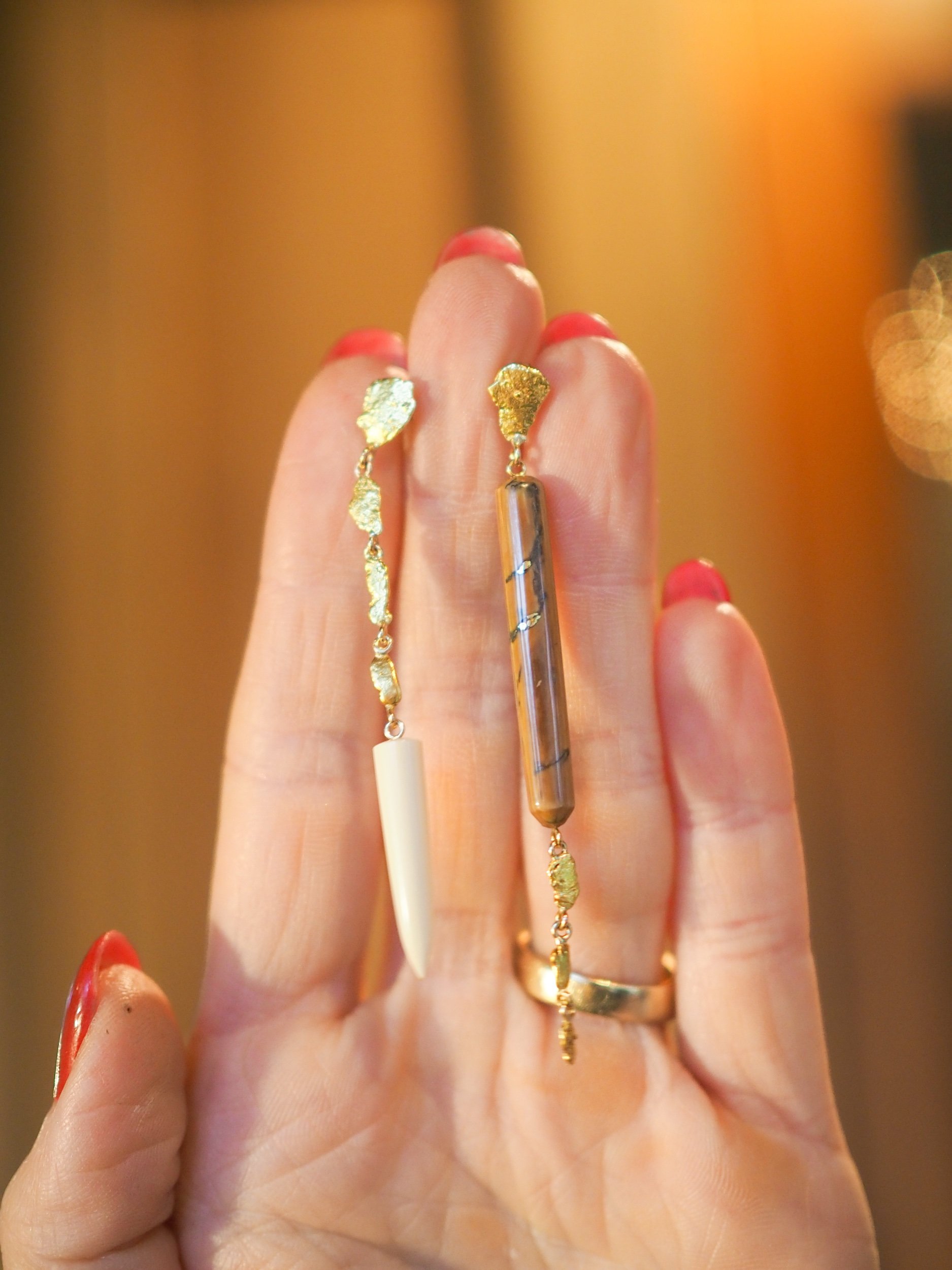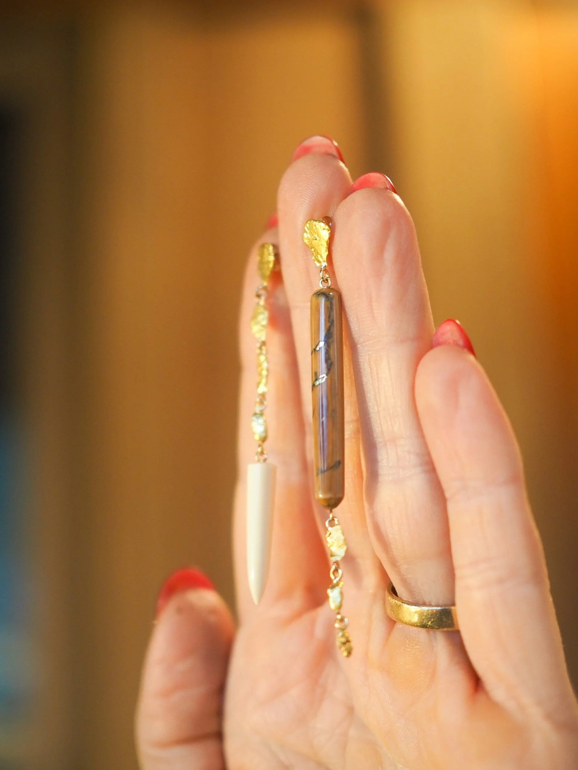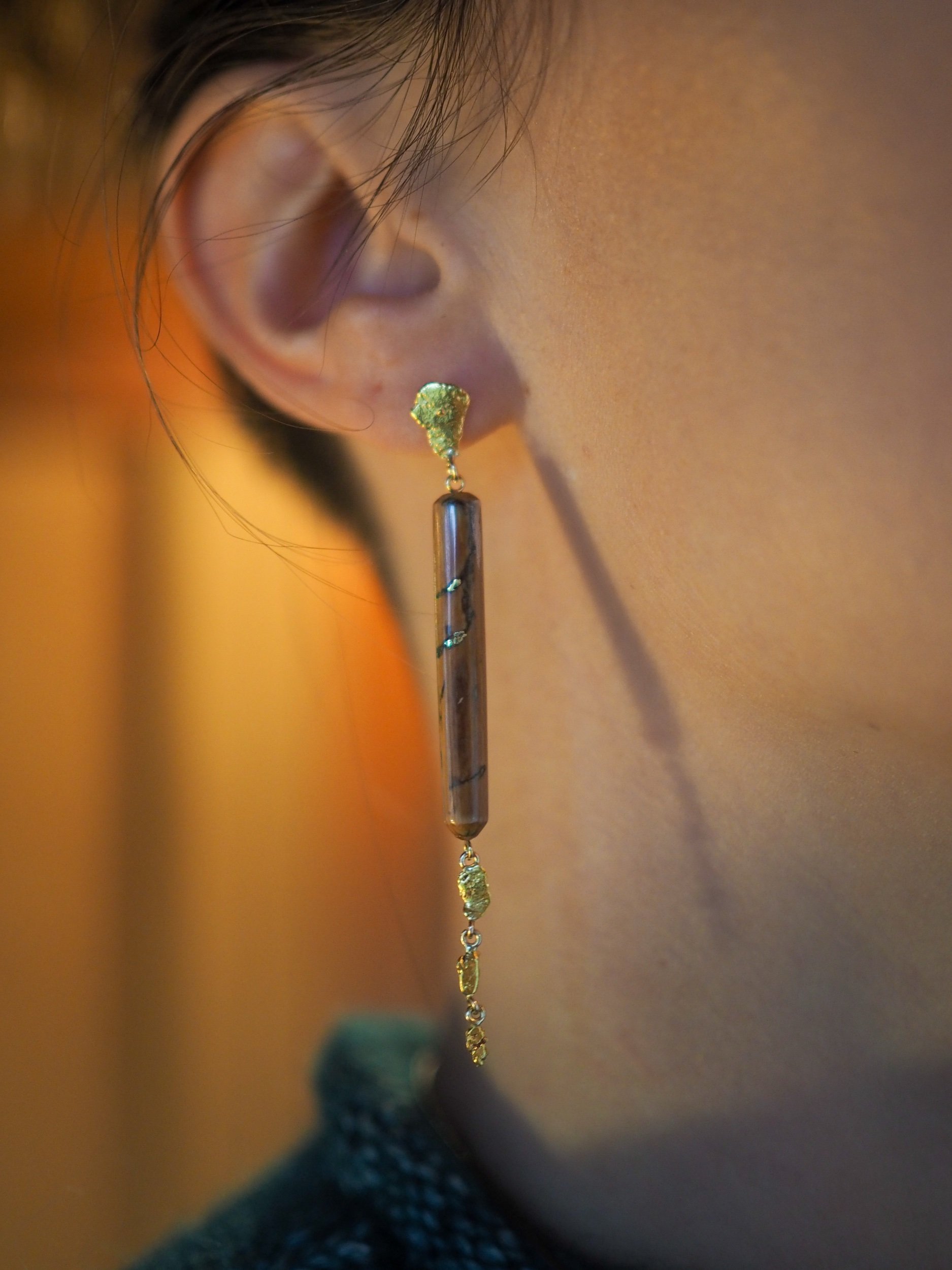 Materials: 14k gold posts, backings, wire and screws. Naturally occurring 21-22k gold nuggets. Subfossilized mammoth tusk discovered at The Boneyard Alaska dating 40,000 - 12,000 years BP