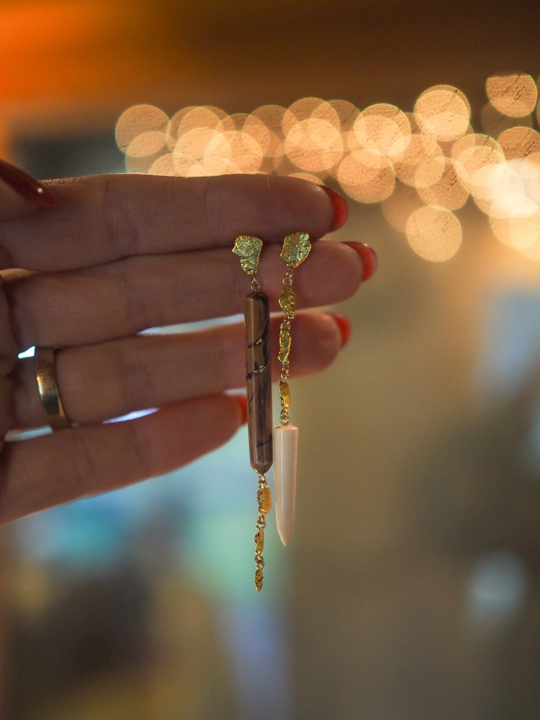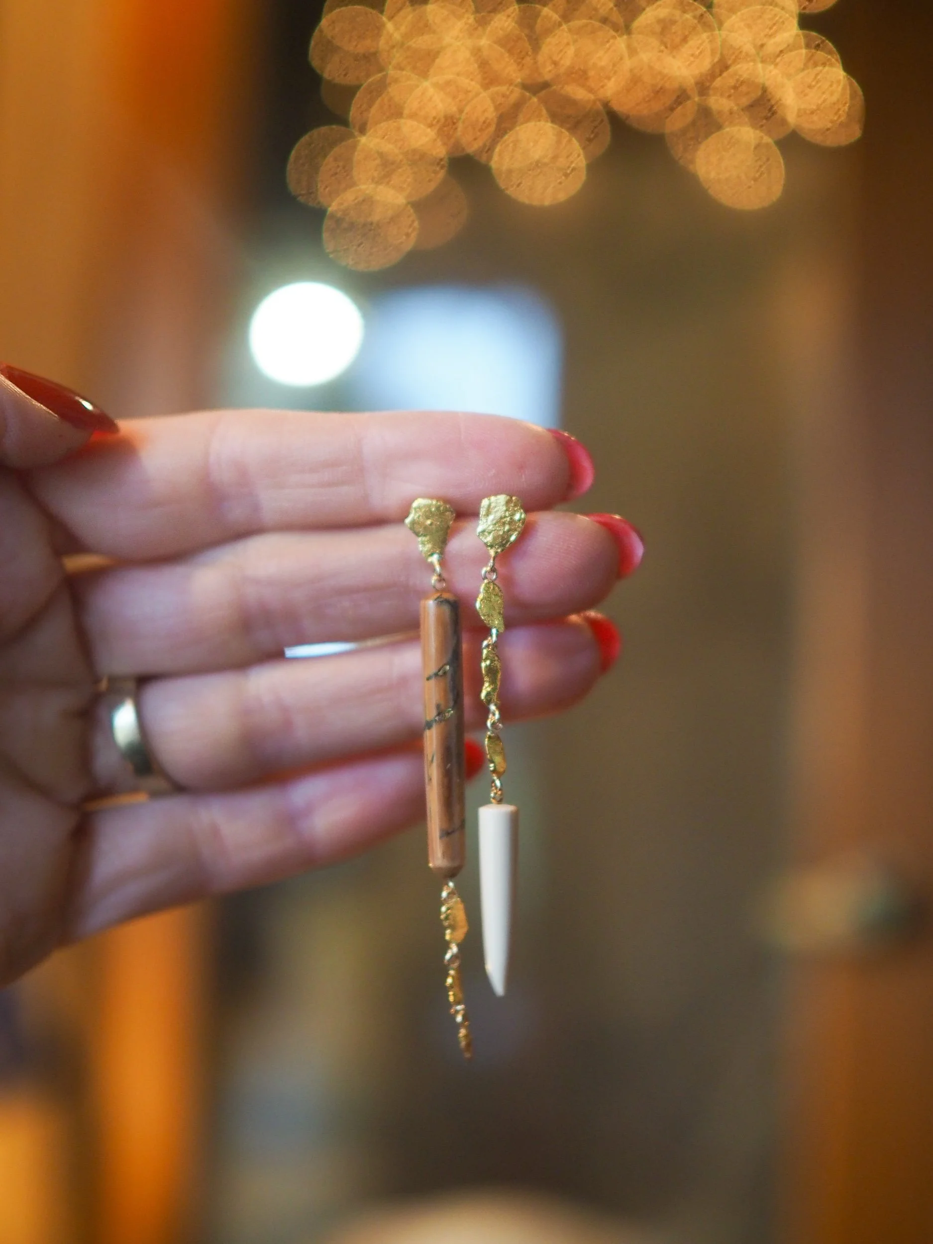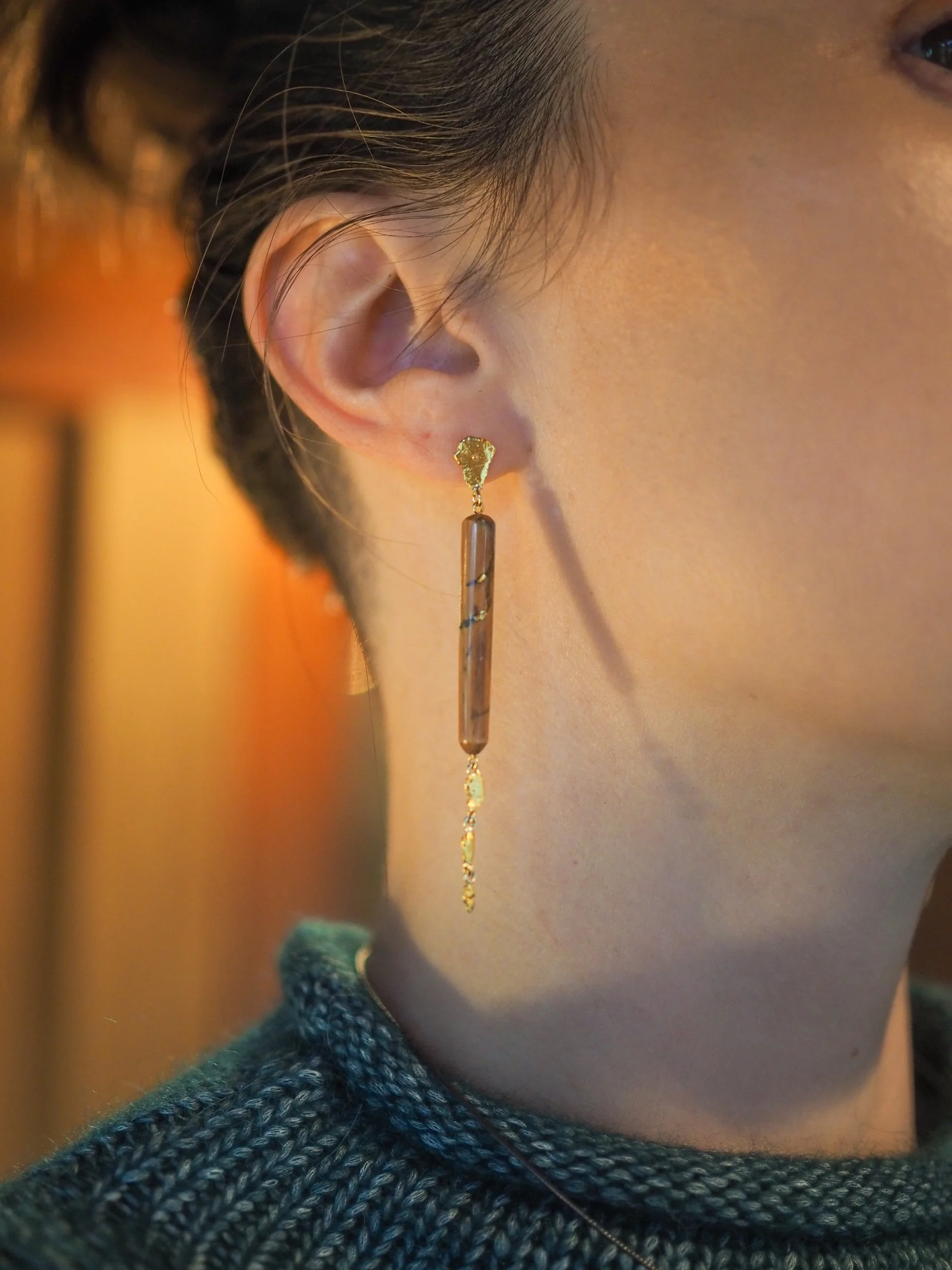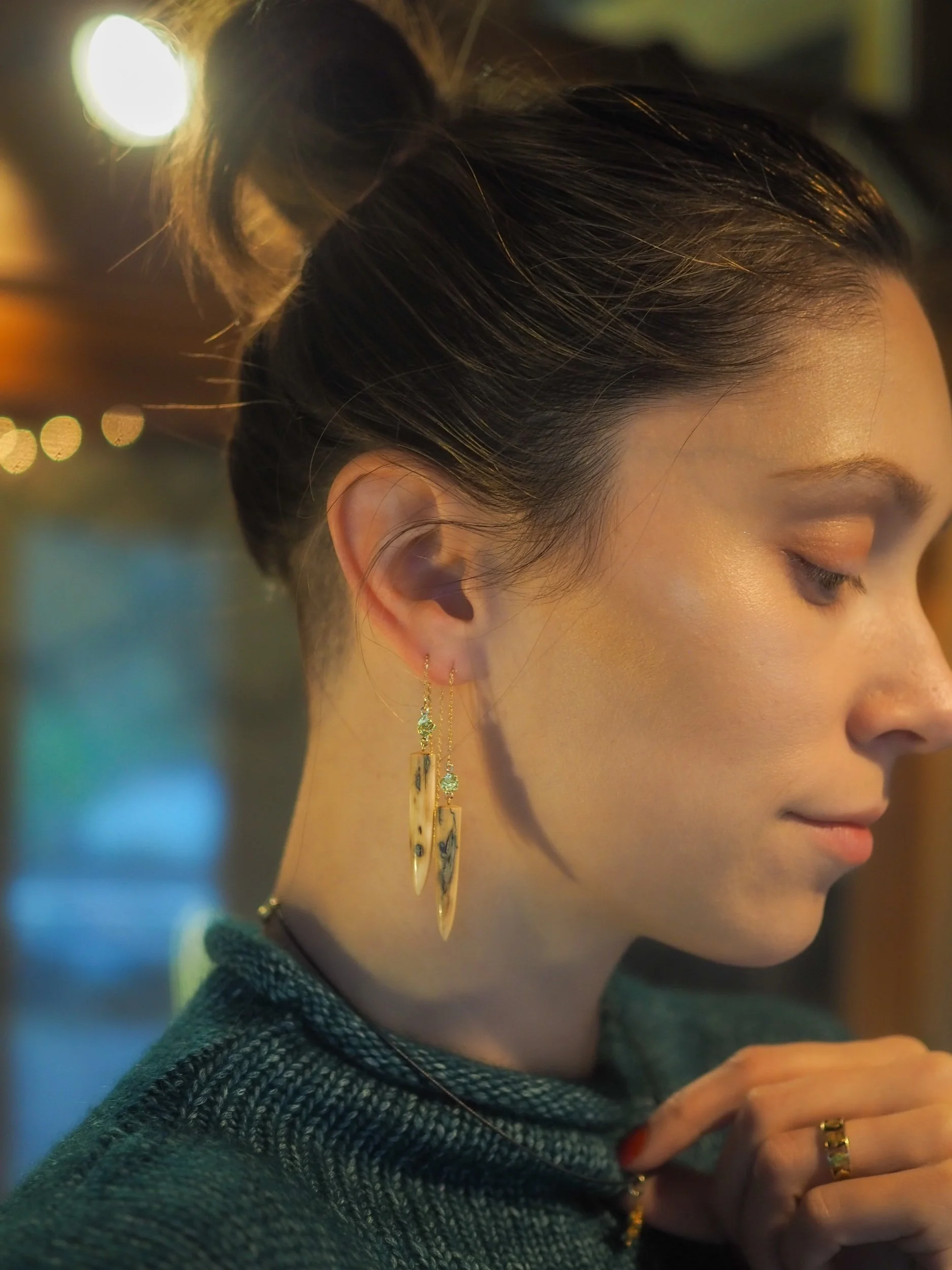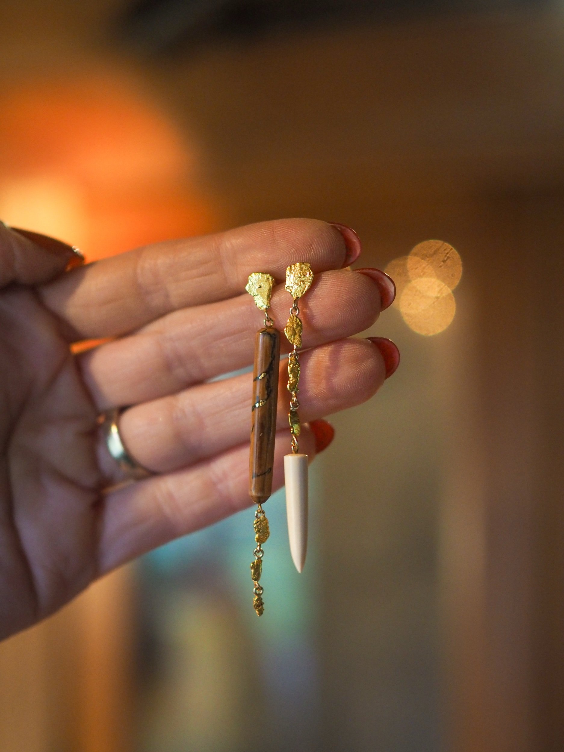 Materials: 14k gold posts, backings, wire and screws. Naturally occurring 21-22k gold nuggets. Subfossilized mammoth tusk discovered at The Boneyard Alaska dating 40,000 - 12,000 years BP