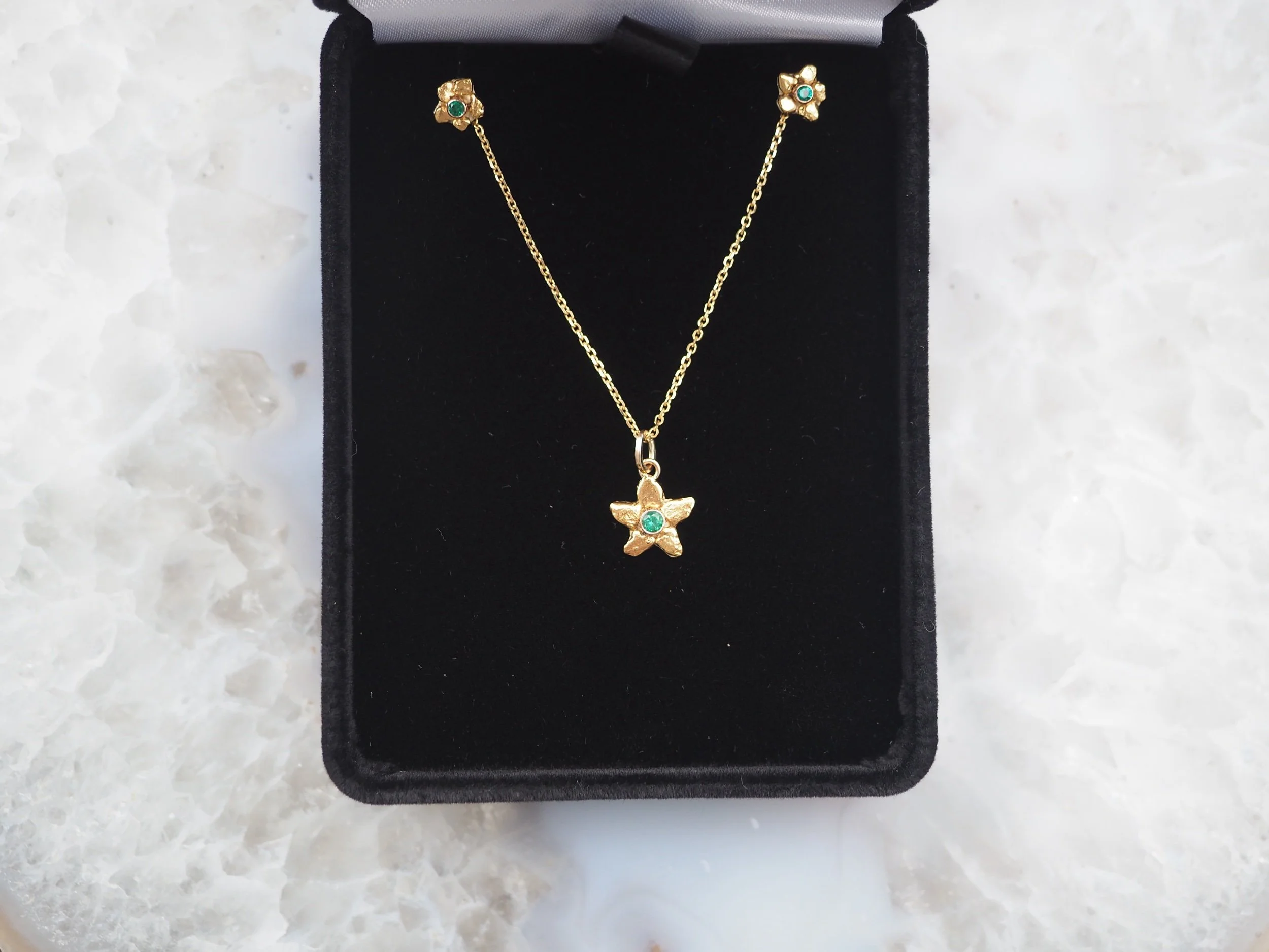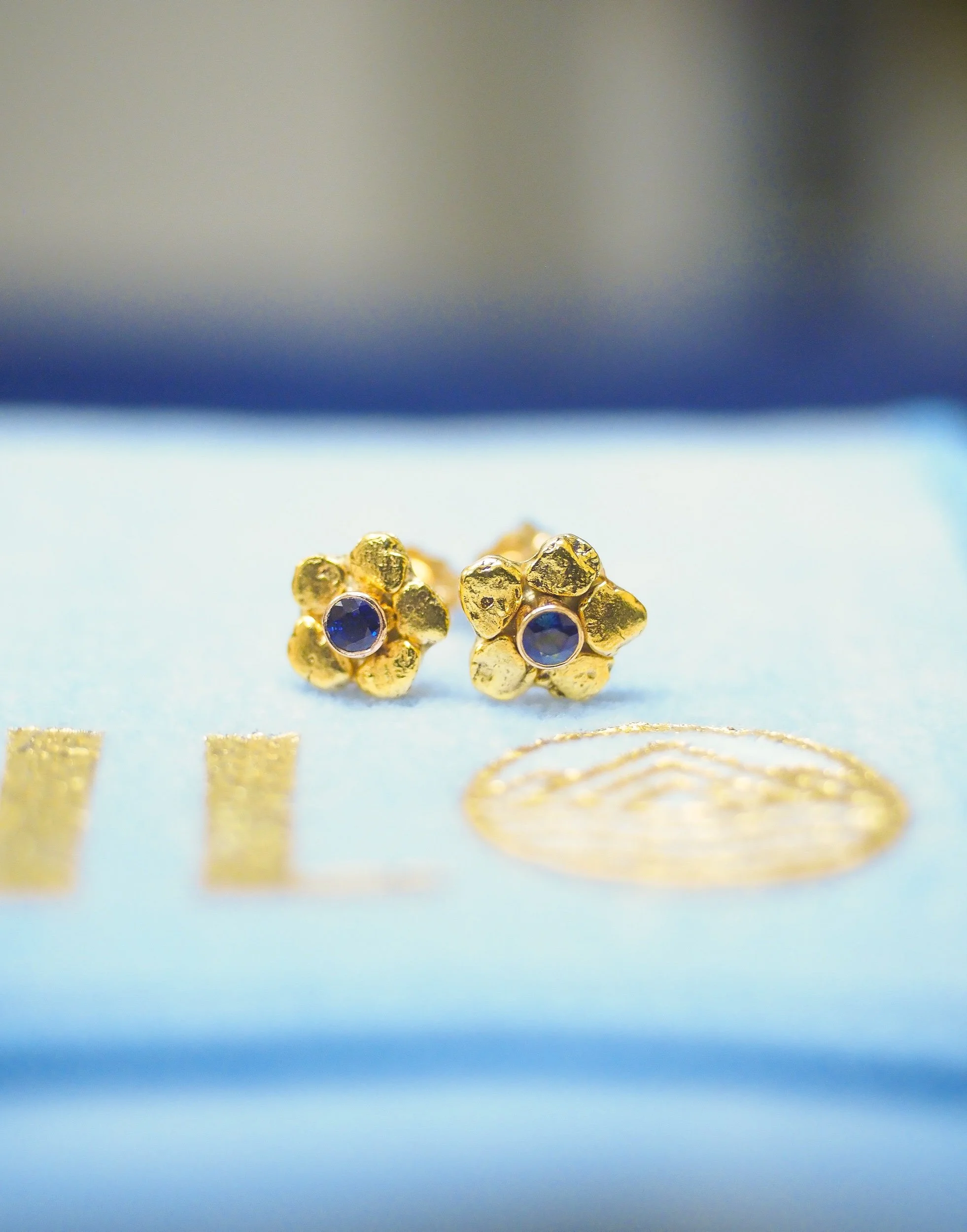 Natural blue sapphire is the centerpiece of these golden wild flowers crafted from remnants of an exploding star, natural Alaskan gold nuggets, connecting life on Earth to life in the cosmos.