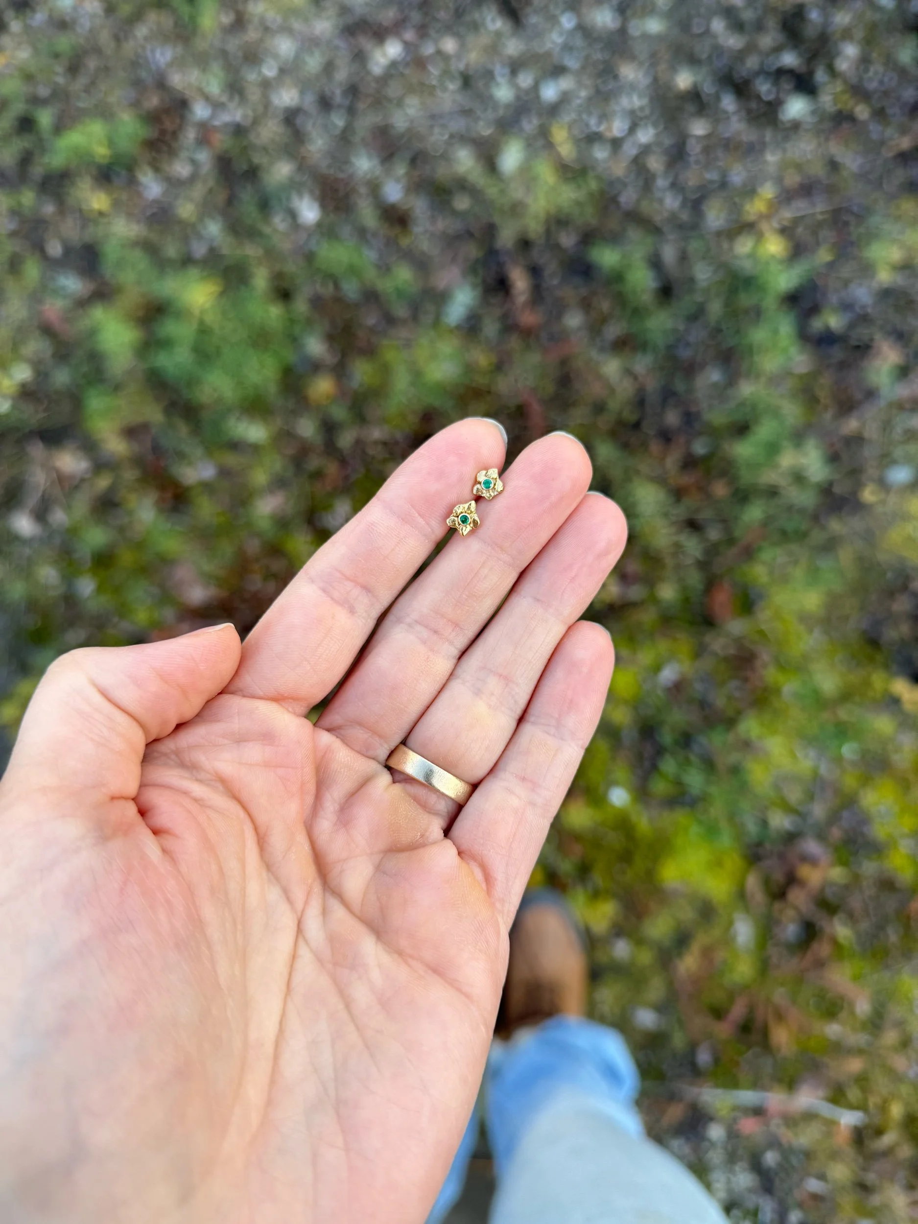 natural 2.5mm sapphire set in 14k gold with approximately 1 gram of raw 22k Alaskan gold nuggets on 14k gold backing with custom 14k gold bail / earring posts and backings, respectively